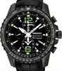 Seiko Sportura Alarm chronograph watch model SNAE97. Quartz movement. Stainless steel black Ion plated case. Black dial with green accents, date, and alarm which can be used as second-time-zone indicator. Black leather band