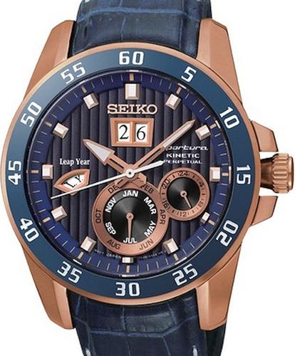 Seiko Sportura Perpetual 100th Anniversary Edition. Watch model SNP064 with perpetual calendar. Large date calendar, leap year indicator, month indicator, 24-hour hand. Rose gold plated stainless steel case with sapphire crystal. Blue color bezel and dial with rose gold tone hands and index markers. Blue leather strap