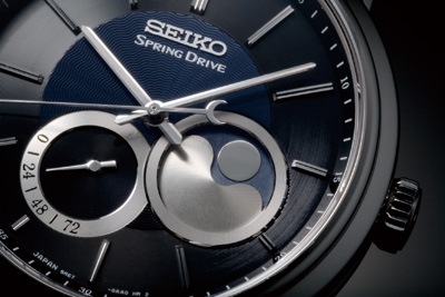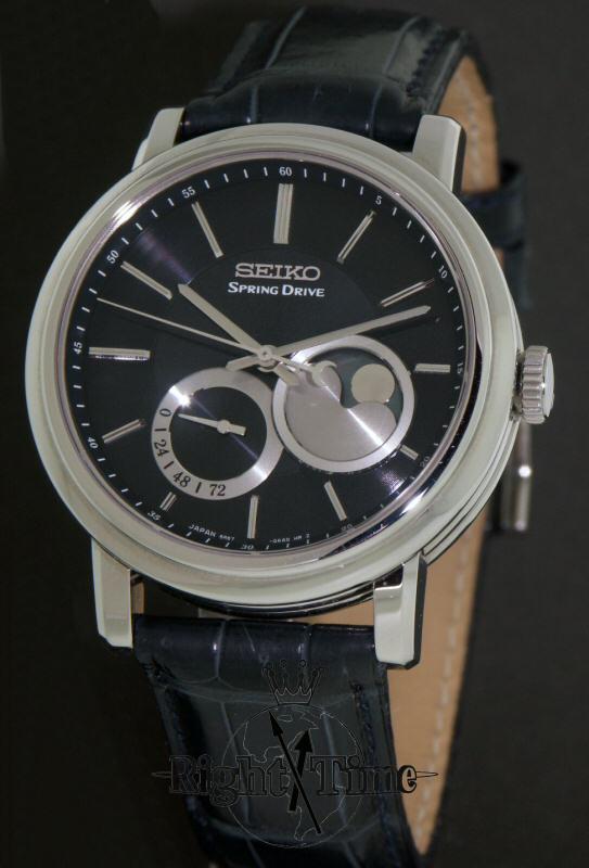 SEIKO Spring Drive, with twenty eight years in the making, finally delivered its first limited edition model of The "quiet revolution" in 2006 with this stunning moon phase indicator piece. Classic and elegant with genuine mother-of-pearl sky and silver applied moon, power reserve indicator and navy blue with black dial.