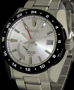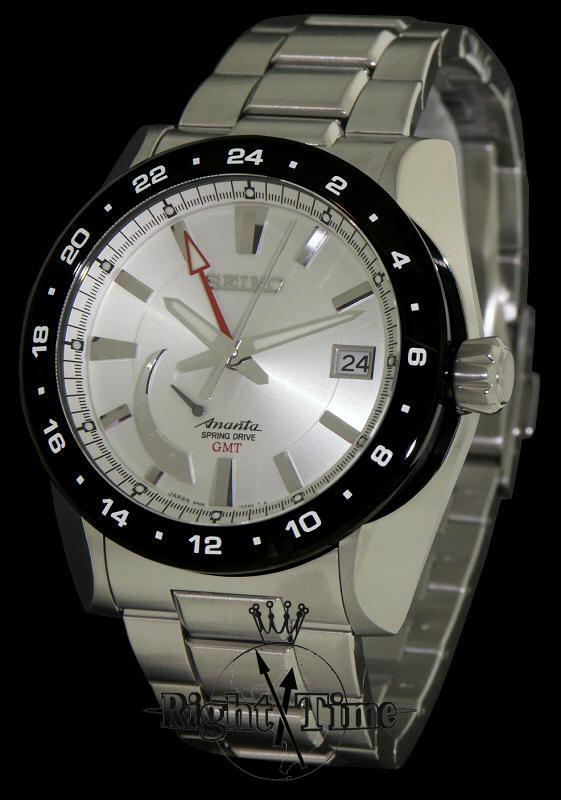 Seiko Ananta spring drive GMT watch model SNR019 with power reserve indicator powered by Seiko 5R66 spring drive movement with 30 jewels. Stainless steel case with black 24-hours bezel, sapphire crystal, silver color dial, steel bracelet.