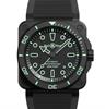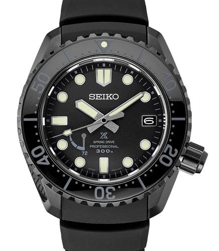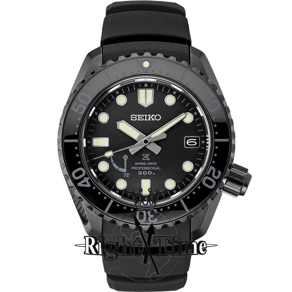 Seiko Prospex Spring Drive SNR031 model with power reserve indicator. Black dial with contrasting highly polished stainless steel markers. Date calendar. 300m water resistant. Sapphire crystal. Black PVD plated titanium case with rubber band.