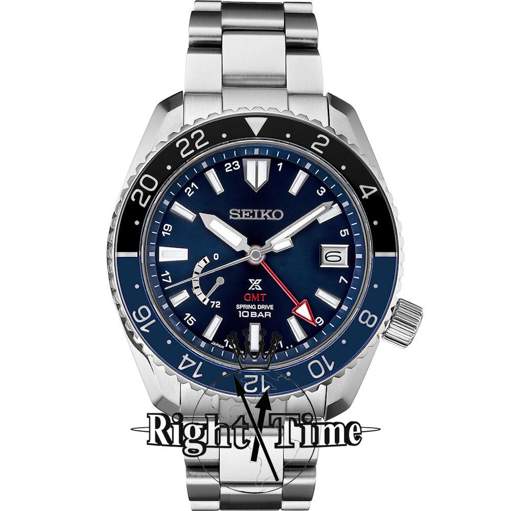 Seiko Prospex Spring Drive SNR033 model with power reserve indicator. Half black/blue 24-hours bezel. Blue dial with luminous markers. Date calendar. 330ft water resistant. Sapphire crystal. Titanium case and bracelet