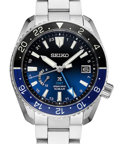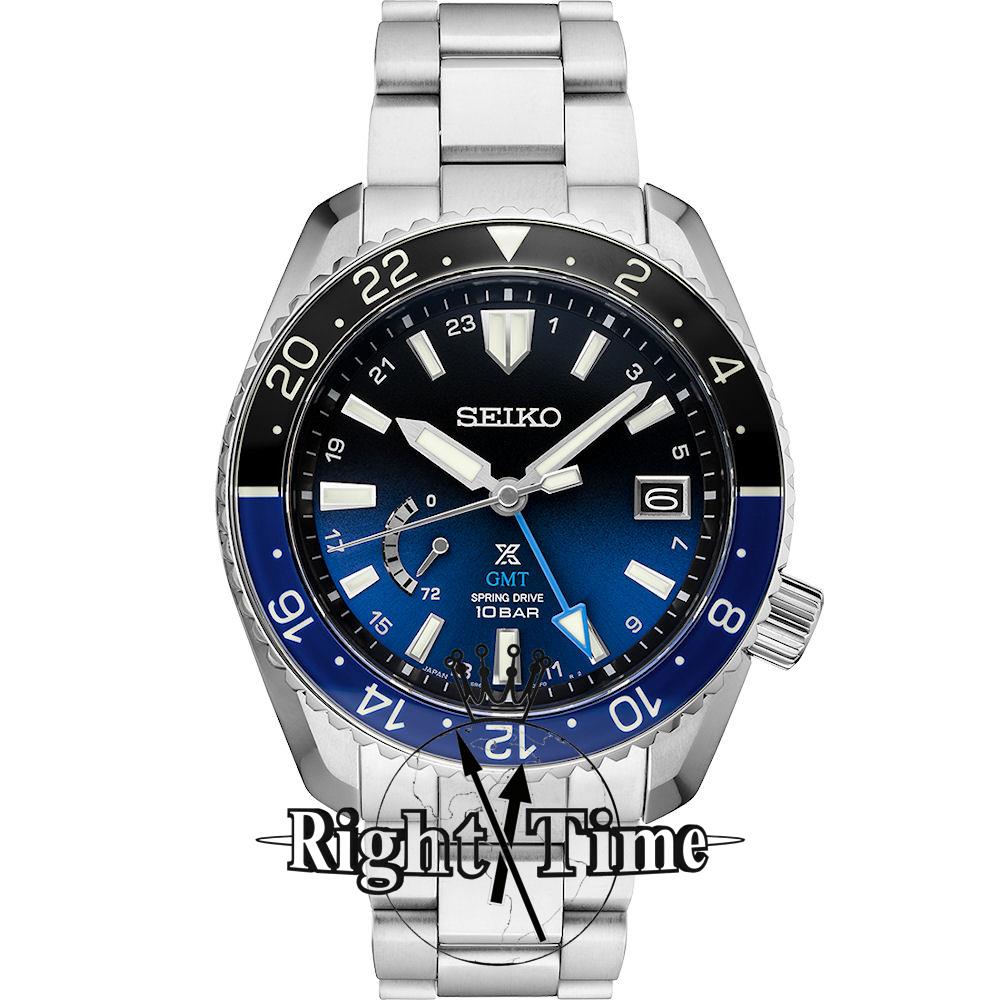 Seiko Prospex Spring Drive SNR049 model with power reserve indicator. Limited edition of 400 pieces. Half black/blue dial with luminous markers. Date calendar. 330ft water resistant. Sapphire crystal. Titanium case and bracelet