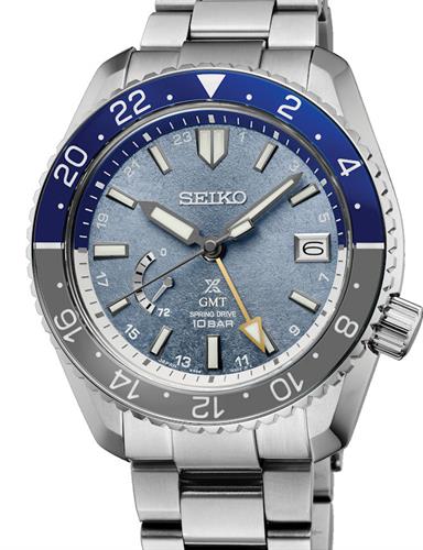Seiko Prospex Special Edition model SNR055. Japanese made Seiko spring drive movement with date, GMT, and power reserve indicator. Solid titanium case and bracelet with super-hard coating. Blue/green dial with LumiBrite hands and markers. Duo-directional bezel with blue/grey 24 hour insert. Sapphire crystal. Rated to 100 meters water resistant.