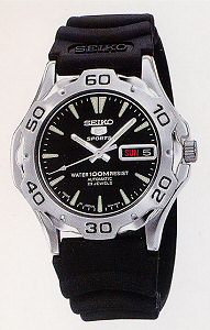 Seiko Automatic wrist watch from Seiko "5" Sports Collection. 100m water resistant. 23 jewels automatic movement, black dial with luminous markers and hands, day/date calendar, stainless steel case with observation case back and rubber watch band.
