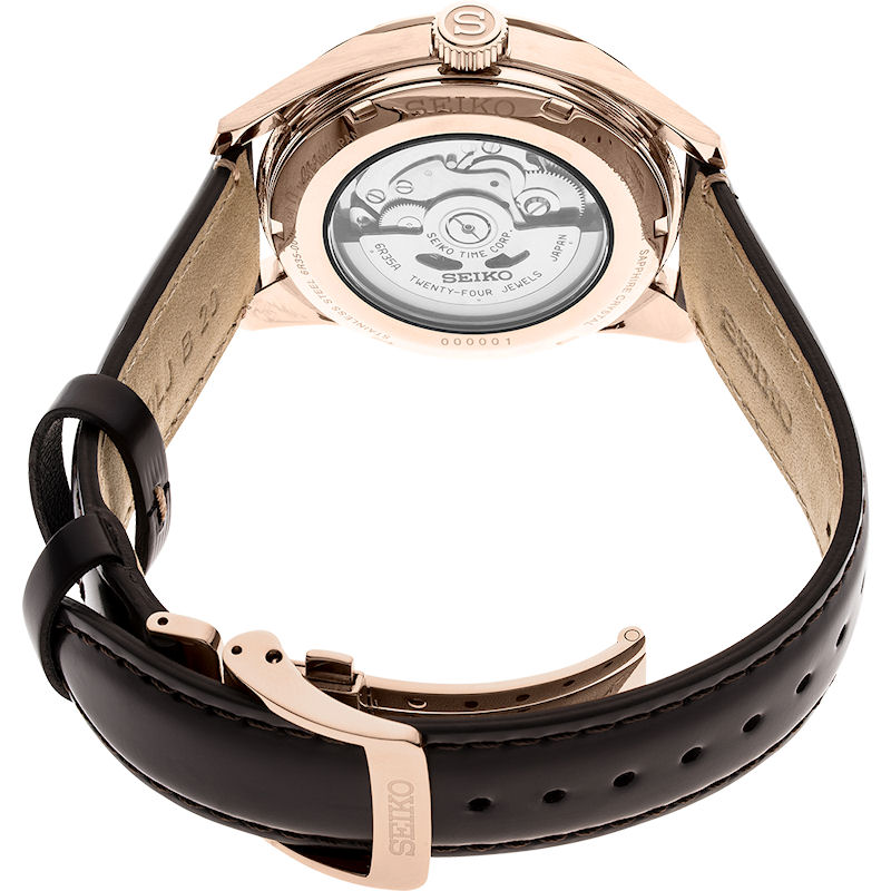 Seiko model SPB165 automatic wrist watch from Seiko Presage Collection. SEIKO Japanese made Automatic movement Caliber 6R35. Rose gold plated stainless steel case, screw-down crown. Textured brown color dial with date calendar. Observation back. Brown leather strap. Water resistant to 100 meters.