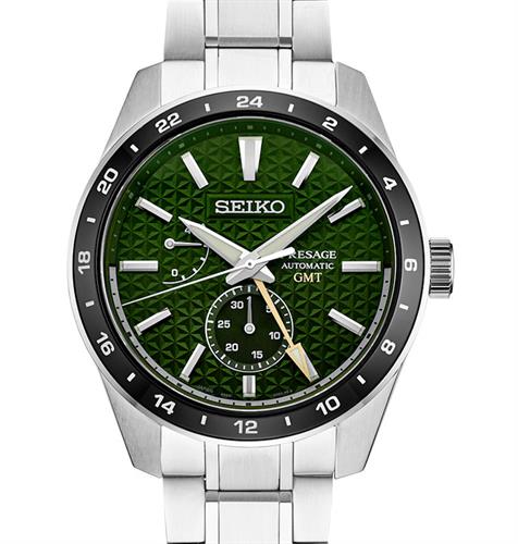 Seiko model SPB219 automatic wrist watch from Seiko Presage Collection. SEIKO Japanese made Automatic movement Caliber 6R64. Stainless steel case, screw-down crown, black 24-hours bezel. Textured green dial with date pointer hand, second time zone, and power reserve indicators. Observation back. Bracelet. Water resistant to 100 meters.