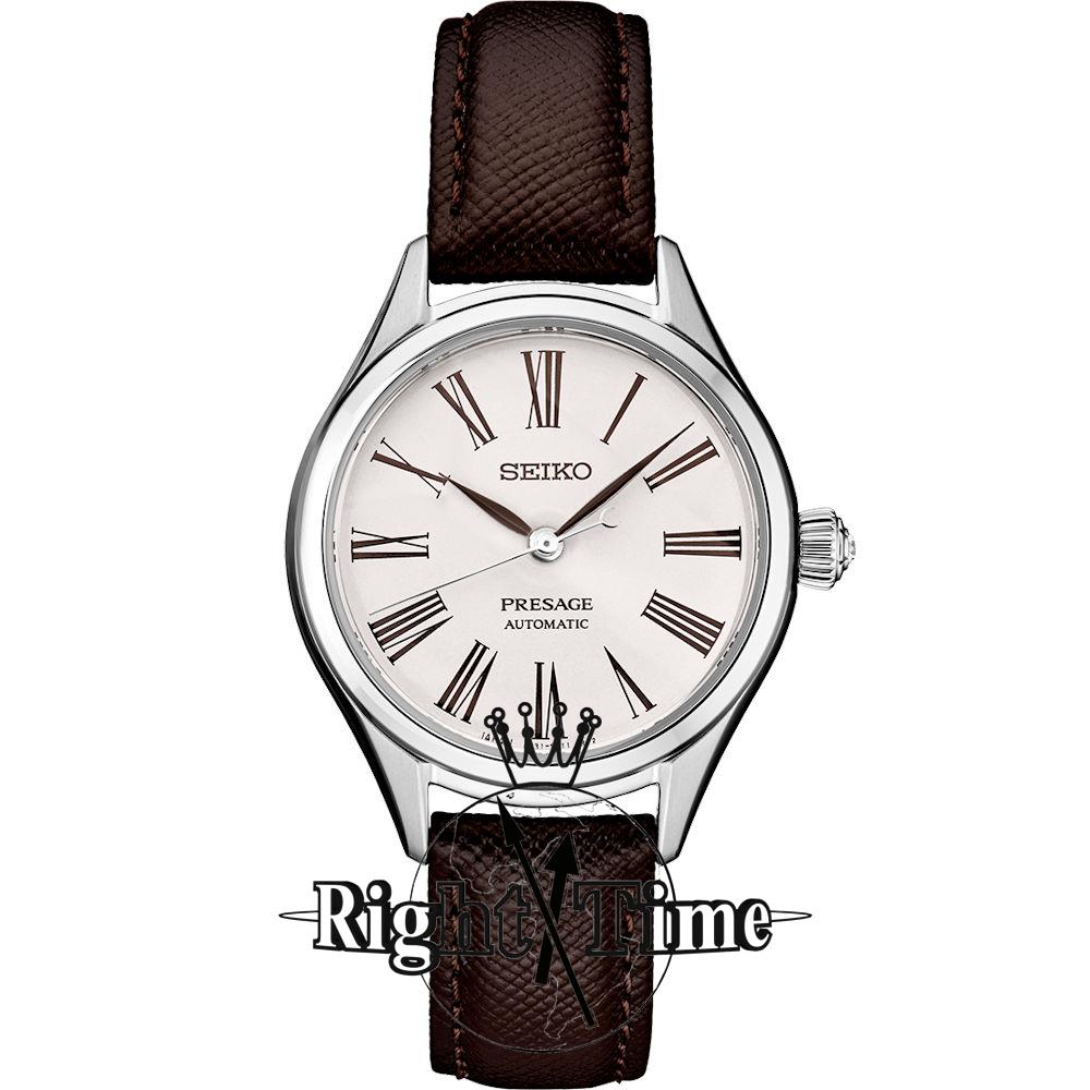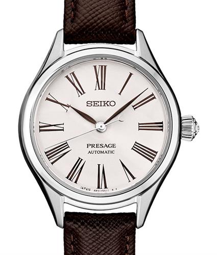 Seiko Presage factory model SPB233. Japanese Seiko 6R31 24 jewel automatic movement with 70 hour power reserve. Stainless steel case. White enamel dial with printed Roman numerals and brown hands. Sapphire crystal. Comes on a brown leather strap with deployant buckle.