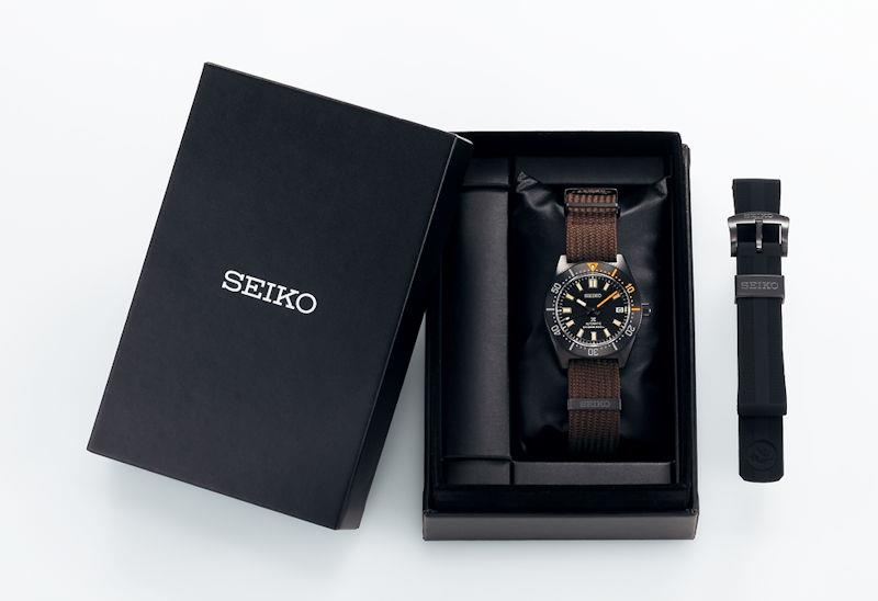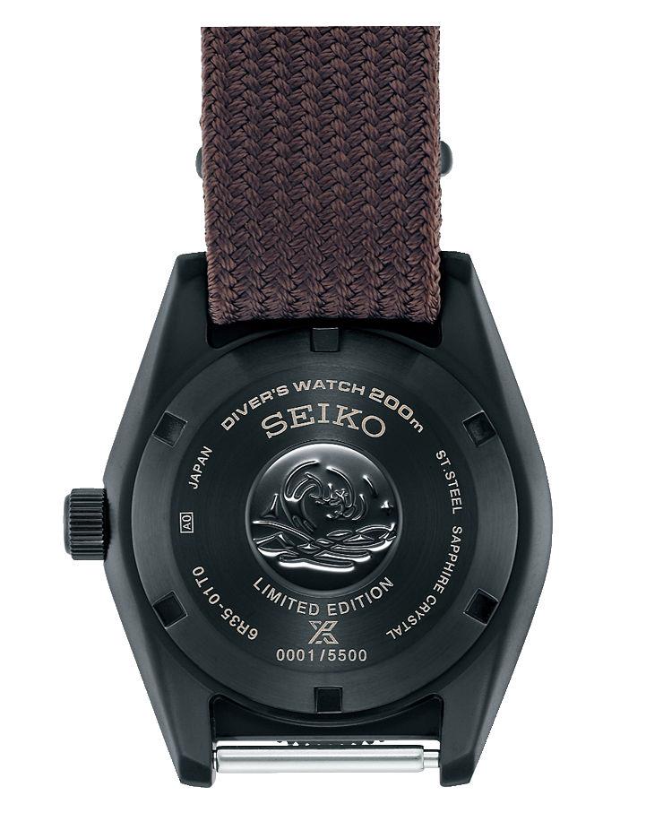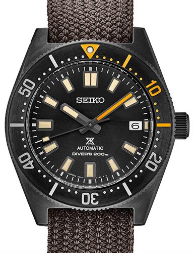 Seiko Prospex "Black Series" model SPB253. Limited edition of 5500 pieces. Japanese automatic 6R35 automatic movement. Stainless steel case with black PVD coating. PVD coated uni-directional bezel with a hint of orange accents. Black dial with aged color LumiBrite painted hands and markers. Comes in a set with both a brown NATO style nylon and black silicone rubber strap. Sapphire crystal. Diver rated to 200meters water resistant.