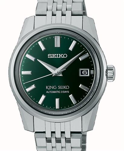 King Seiko model SPB373. Seiko solid stainless steel case. Japanese automatic movement. Green color dial. Sapphire crystal. Steel bracelet.