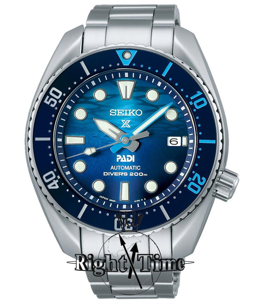 Seiko Prospex Master Sumo watch model SPB375. Special edition "Great Blue" PADI. Powered by the Seiko Caliber 6R35 automatic movement. Stainless steel case and bracelet. Uni-directional bezel with blue 60 minute ceramic insert. The blue dial is inspired by the ocean as seen underwater. LumiBrite filled hands and markers. Rated to 200 meters water resistant. Sapphire crystal.