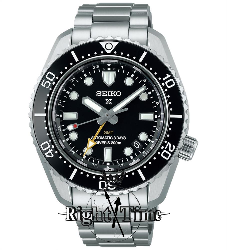 Seiko Prospex 1968 Diver`s Modern Re-Interpretation GMT model SPB383. Powered by the Japanese Seiko Caliber 6R54 automatic with GMT function. Stainless steel case and bracelet. Black dial with LumiBrite filled hands and markers. Uni-directional rotating bezel with black 60 minute ceramic insert. Sapphire crystal. Diver rated to 200 meters water resistant.