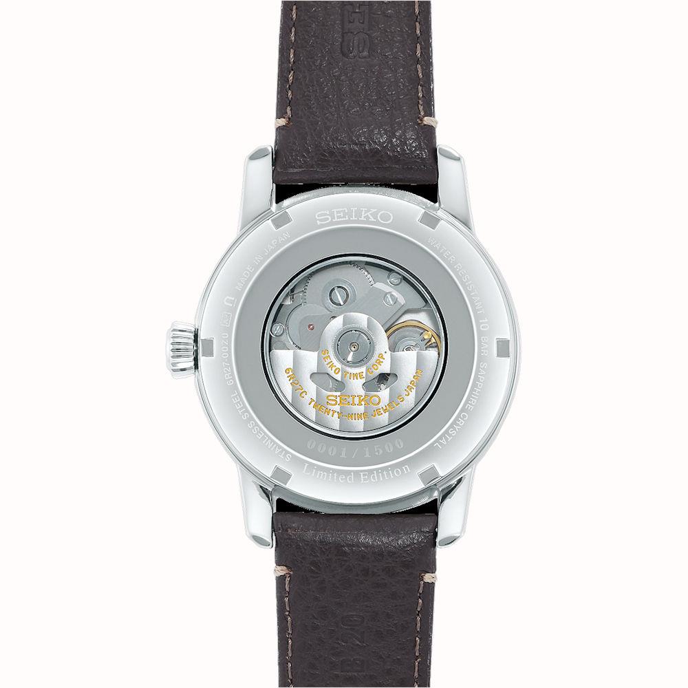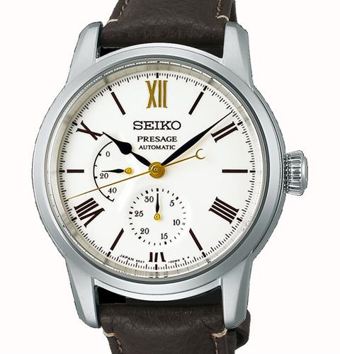 Seiko Presage Craftsmanship Series model SPB397. Seiko 110th Anniversary Limited Edition of 1500 pieces. SEIKO Japanese made Automatic movement Caliber 6R27. Solid stainless steel case with observation back. White porcelain dial with pointer-hand-date calendar and power reserve hand. Brown leather strap. Domed sapphire crystal with anti glare coating.