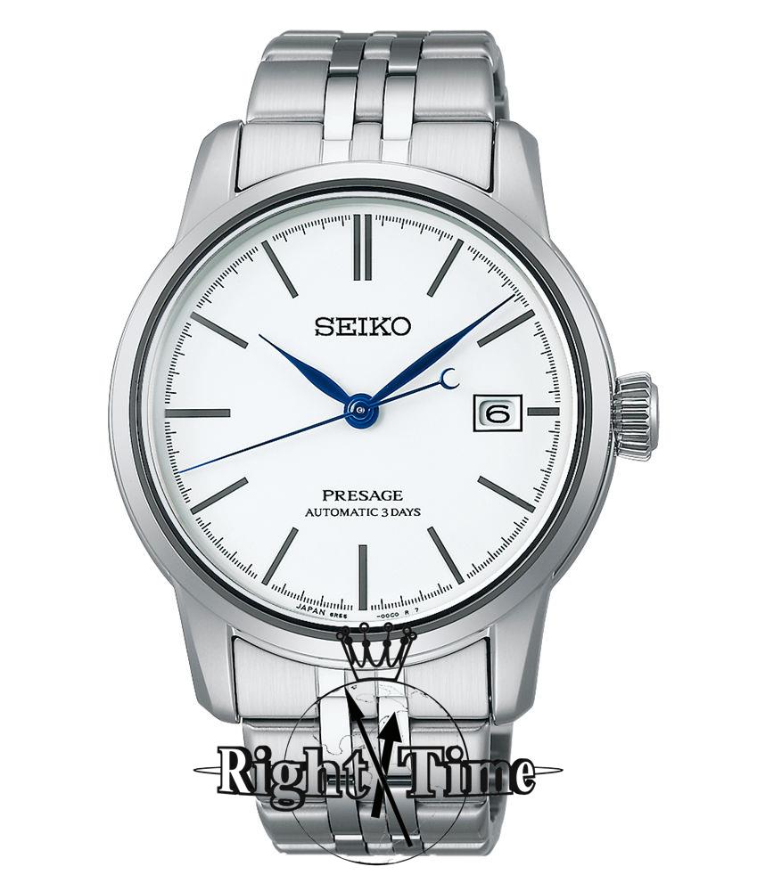 Seiko Presage Craftsmanship series model SPB403. Japanese Seiko Caliber 6R55 automatic movement. Solid stainless steel case and bracelet. White enamel dial with blued hands and grey tone markers. Sapphire crystal with anti-glare treatment. Water resistant to 100 meters.