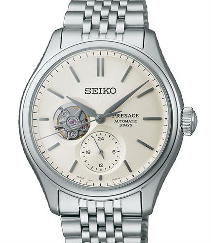 Seiko Presage Classic Series model SPB469. Japanese Seiko Caliber 6R5j automatic movement. Solid stainless steel case with bracelet. Ivory textured dial with "open heart" at 9 o`clock position, 24-hours sub-dial at 6 o`clock, steel hands and markers. Sapphire crystal with anti-glare treatment. Water resistant to 100 meters.