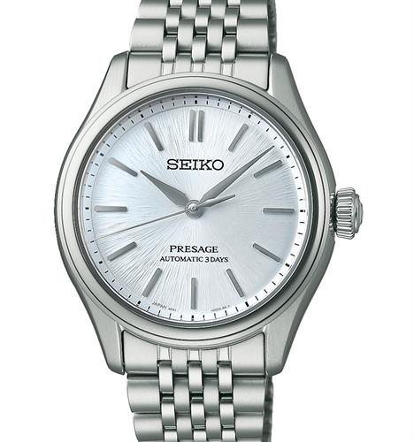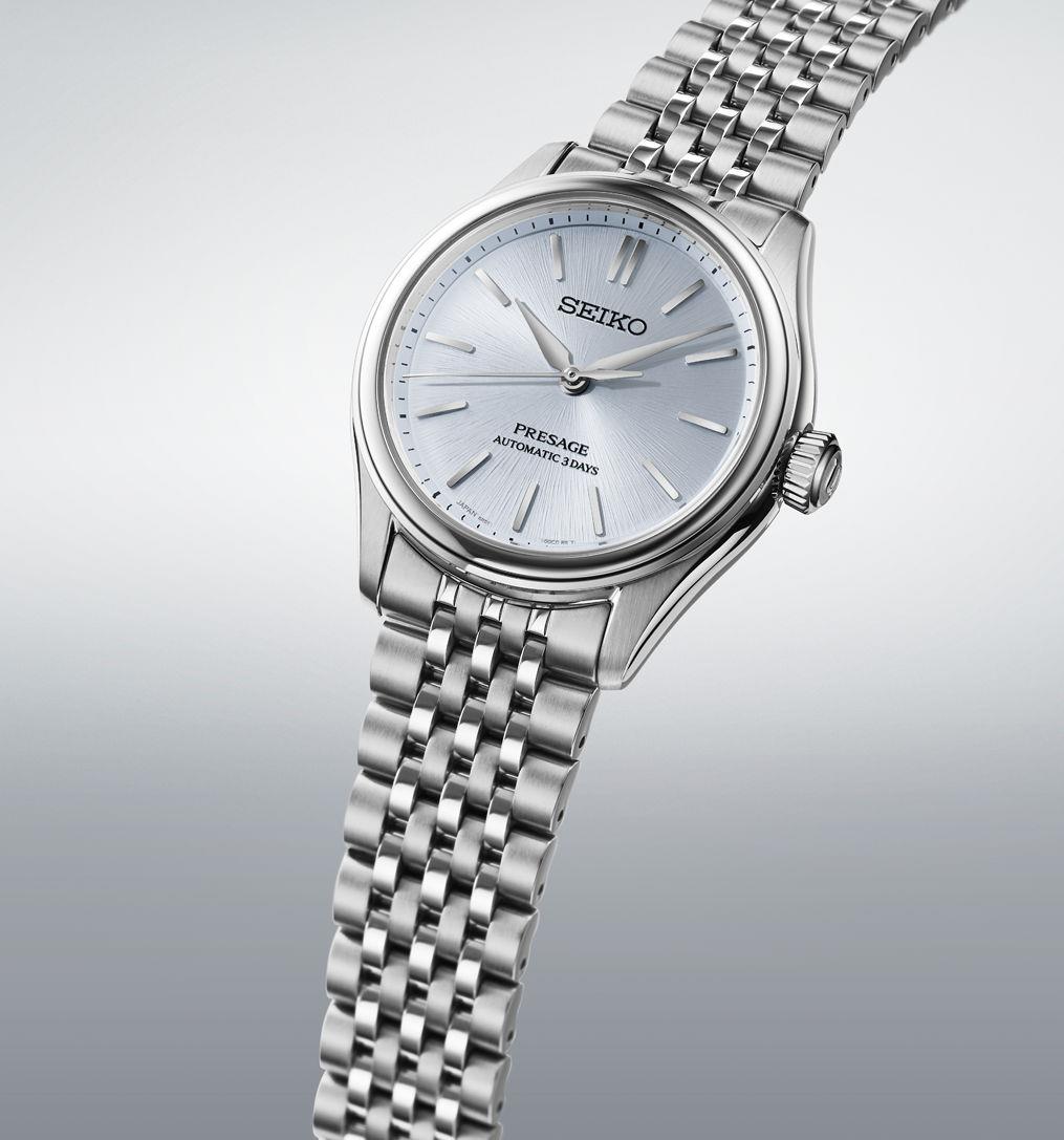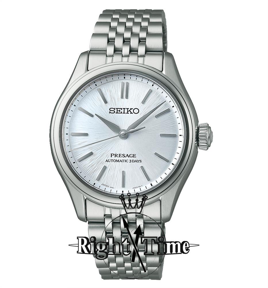 Seiko Presage Classic Series model SPB521. Japanese Seiko Caliber 6R51 automatic movement. Solid stainless steel case with bracelet. Light blue textured dial with steel hands and markers. Sapphire crystal with anti-glare treatment. Water resistant to 100 meters.
