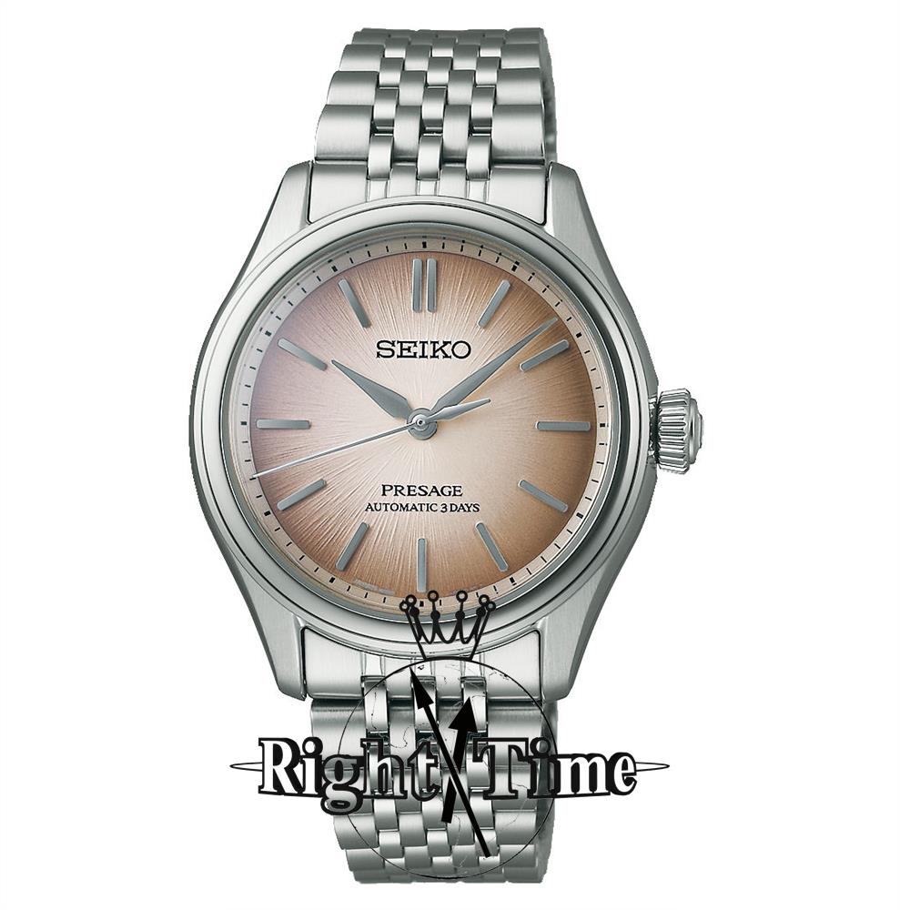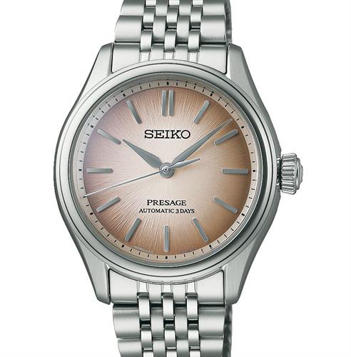 Seiko Presage Classic Series model SPB523. Japanese Seiko Caliber 6R51 automatic movement. Solid stainless steel case with bracelet. Light brown textured dial with steel hands and markers. Sapphire crystal with anti-glare treatment. Water resistant to 100 meters.