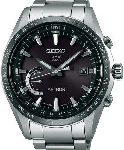 Seiko Astron GPS Solar World Time watch. Understands all the 40 official time zones. Accurate time, anywhere on earth. Perpetual day/date calendar. Convenient, simple and elegant. Daylight savings and power saving functions. Black dial. Titanium case and bracelet. Black ceramic bezel. Sapphire crystal.