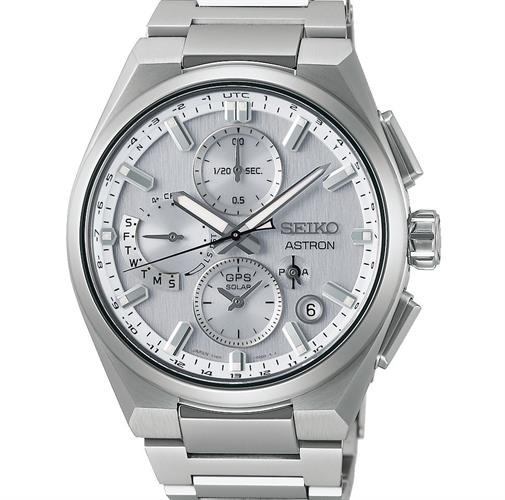 Seiko Astron GPS Solar Dual-Time Chronograph watch model SSH159. GPS controlled time and time zone adjustment. Dual-Time. Perpetual calendar. World time in 39 time zones. Silver color dial inside titanium case on bracelet. Sapphire crystal.