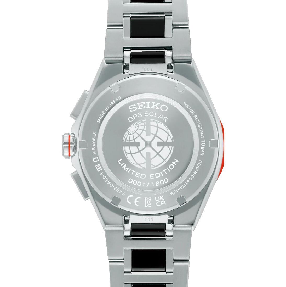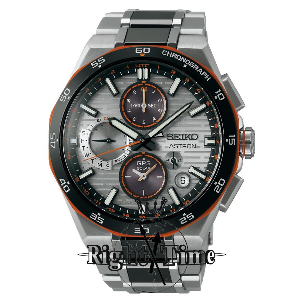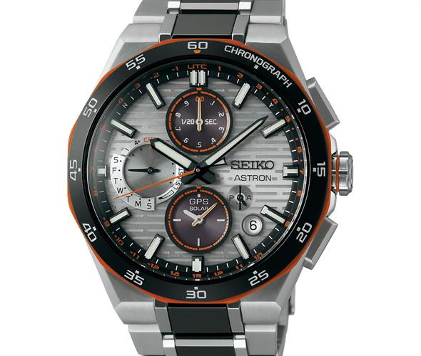 Seiko Astron GPS Solar Dual-Time Chronograph watch model SSH183. Limited Edition of 1200 pieces. GPS controlled time and time zone adjustment. Dual-Time. Perpetual calendar. World time in 39 time zones. Silver color dial design inspired by the high-speed journey of light. Comes in titanium case on bracelet with black bezel and orange color accents. Sapphire crystal.
