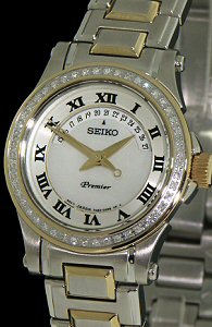 Seiko Premier ladies watch model SXD774. Multi-date calendar at the top of white Mother-of-Pearl dial. Polished and satin finished case and bracelet with gold plated accents and diamonds on the bezel. Sapphire crystal. Roman numerals.