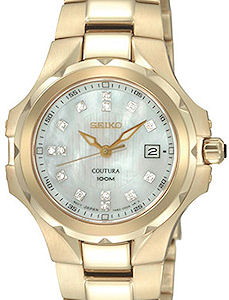 Seiko SXDB62 Lady wrist watch from Seiko Coutura Collection. SEIKO Japanese Quartz movement. Gold plated stainless steel case. White Mother-of-pearl dial with date calendar and diamond markers. Gold plated stainless steel watch bracelet.