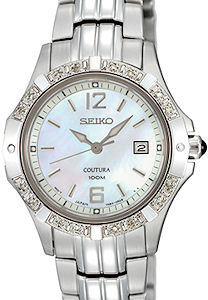 Seiko SXDE19 Lady wrist watch from Seiko Coutura Collection. SEIKO Japanese Quartz movement. Stainless steel case with diamonds on the bezel. Mother-of-pearl dial with date calendar. Stainless steel watch bracelet.