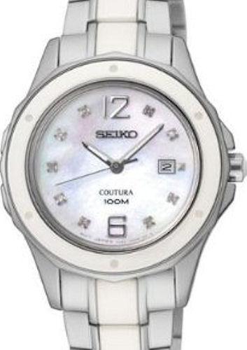Seiko SXDE85 Lady wrist watch from Seiko Coutura Collection. SEIKO Japanese Quartz movement. Stainless steel case with white ceramic bezel. Mother-of-pearl dial with date calendar and diamond markers. Stainless steel and white ceramic watch bracelet.