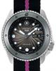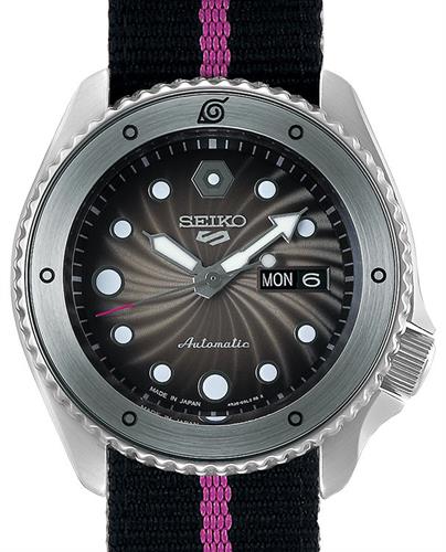 Seiko 5 SBSA087 sports wrist watch. Naruto Boruto Limited edition of 6,500 pieces. 100m water resistant, powered by SEIKO 24 jewels 4R36 Japanese Automatic movement with Day/Date calendar. Stainless steel case with uni-directional rotating steel insert. Black NATO style nylon strap with pink center stripe. Grey textured dial with Lumibrite filled hands and markers.