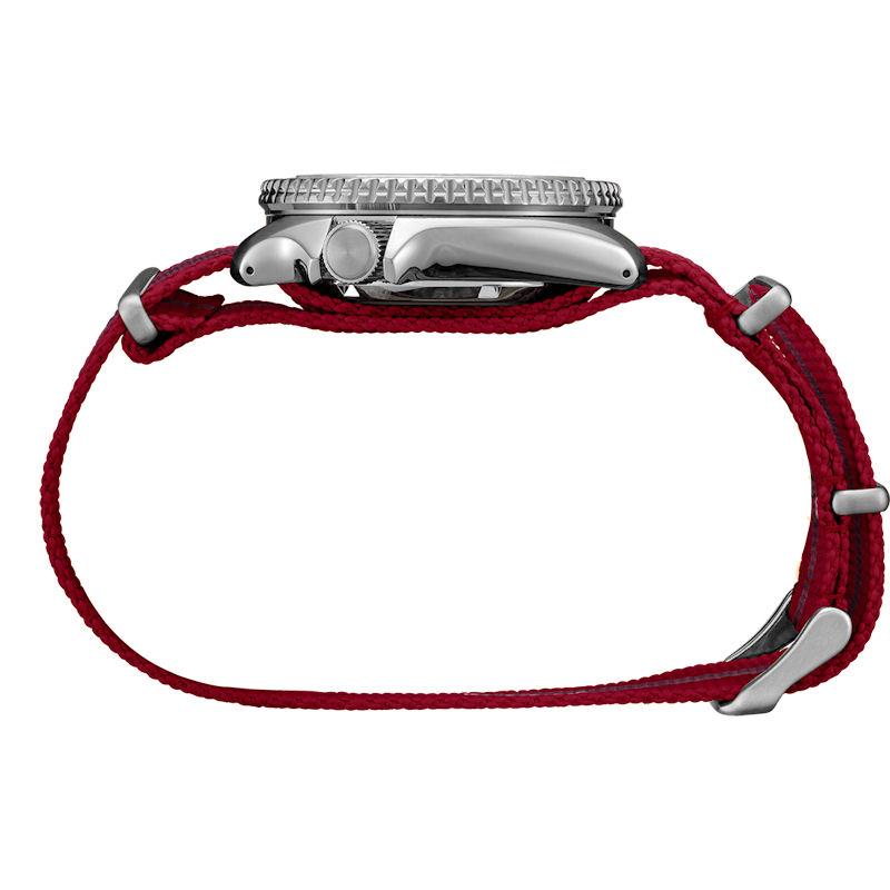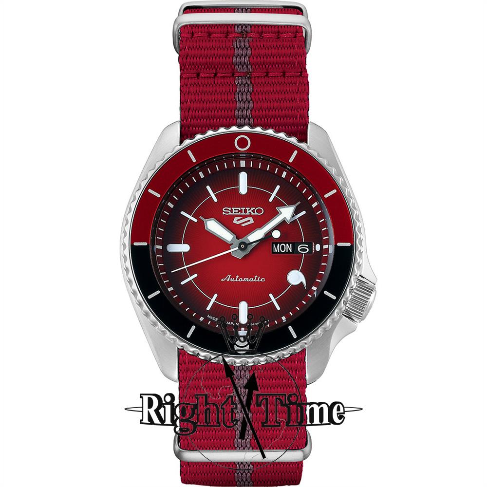 Seiko 5 SBSA089 sports wrist watch. Limited edition of 6,500 pieces. 100m water resistant, powered by SEIKO 24 jewels 4R36 Japanese Automatic movement with Day/Date calendar. Stainless steel case with uni-directional rotating red/black insert 0-60 bezel and red nylon strap. Red color dial with Lumibrite hands and markers.