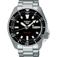 Seiko 5 Sports model SRPK89. Japanese SEIKO 4R36 automatic movement with day/date. Stainless steel case. Black dial with LumiBrite filled hands/markers. Steel bracelet. Water resistant to 100 meters.