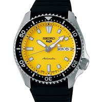 Seiko 5 sports SKX Series model SRPL87. 100m water resistant, powered by SEIKO 24 jewels 4R36 Japanese Automatic movement with Day/Date calendar. Stainless steel case with uni-directional rotating black insert 0-60 bezel and black rubber band. Yellow color dial with Lumibrite hands and markers.