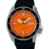 Seiko 5 sports SKX Series model SRPL89. 100m water resistant, powered by SEIKO 24 jewels 4R36 Japanese Automatic movement with Day/Date calendar. Stainless steel case with uni-directional rotating black insert 0-60 bezel and black rubber band. Orange color dial with Lumibrite hands and markers.