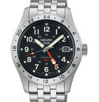 Seiko 5 Sports Field Series model SSK023. Seiko caliber 4R34 automatic movement with date and GMT functions. Solid stainless steel case and bracelet. Black dial. LumiBite filled hands and markers. Duo-directional rotating bezel with 24 hour insert. Hardlex mineral glass crystal. Water resistant to 100 meters.