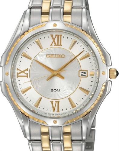 Seiko SGEE94 wrist watch from Seiko Men`s Sport Watches Collection. 50m Water Resistant. SEIKO Japanese Quartz movement with Date calendar. Stainless steel case with gold plated accents. Silver color dial with gold tone markers. Stainless steel watch bracelet with gold plated accents