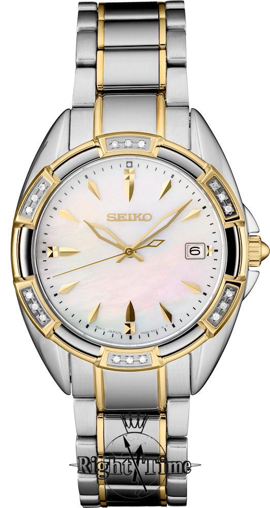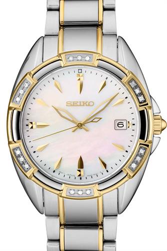 Seiko watch model SKK880 from Seiko Diamonds Collection. Stainless steel case and watch bracelet with yellow gold plated accents, 18 diamonds, white Mother-of-Pearl dial with date, sapphire crystal.
