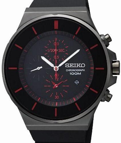 Seiko chronograph watch model SNDD61 from Seiko Sport Collection. Stainless steel black plated case and rubber strap, black dial with red accents