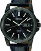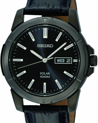 Seiko Solar power watch model SNE097. Stainless steel black plated round case. Black color dial with day/date. Black leather band. 100 meters water resistant