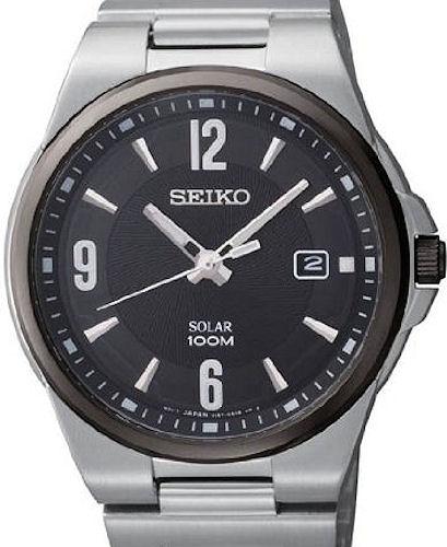 Seiko Solar powered wrist watch model SNE211. 100m Water Resistant. SEIKO Japanese Quartz movement with Day calendar. Stainless steel case with black bezel. Black color dial. Stainless steel bracelet