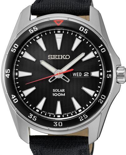 Seiko Solar powered wrist watch model SNE399. 100m Water Resistant. SEIKO Japanese Quartz movement with Day/date calendar. Stainless steel case with black bezel. Black textured dial. Black band