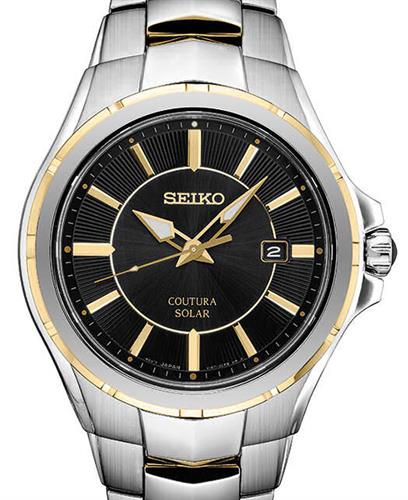 Seiko Solar powered wrist watch model SNE412. 100m Water Resistant. SEIKO Japanese Quartz movement with date calendar. Stainless steel case and bracelet with gold ton accents. Black textured dial.