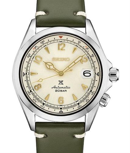 Seiko Alpinist model SPB123 automatic wrist watch from Seiko Prospex Collection. SEIKO Japanese made Automatic movement Caliber 6R35. Stainless steel case, screw-down crown. Champagne color dial with date calendar. Green leather band. Water resistant to 200 meters.