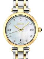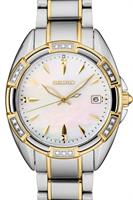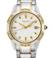 Seiko watch model SKK880 from Seiko Diamonds Collection. Stainless steel case and watch bracelet with yellow gold plated accents, 18 diamonds, white Mother-of-Pearl dial with date, sapphire crystal.