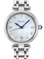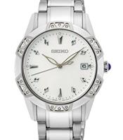 Seiko watch model SKK727. Stainless steel case with diamonds on the bezel. Steel bracelet. White dial with date. Sapphire crystal. Water resistant to 100 meters