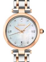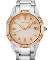 Seiko watch model SKK878 from Seiko Diamonds Collection. Stainless steel case and watch bracelet with rose gold plated accents, 18 diamonds, white Mother-of-Pearl dial with date, sapphire crystal.