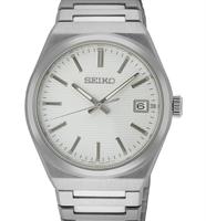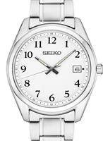 Seiko watch model SUR553. Quartz movement. Stainless steel 39mm round case with bracelet. White color dial with date calendar. 100 meters water resistant