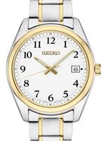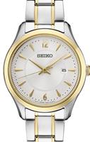 Seiko watch model SUR460. Quartz movement. Stainless steel round case with bracelet and gold tone accents. White color dial with date calendar and Arabic numerals. 100 meters water resistant