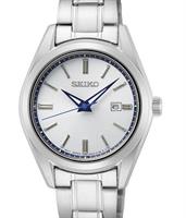 Seiko watch model SUR463. Quartz movement. Stainless steel 30mm round case with bracelet. Silver color dial with date calendar, blue luminous hands, and blue outer ring. 100 meters water resistant