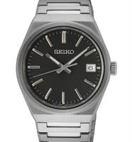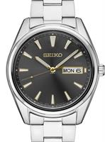 Seiko watch model SUR557. Quartz movement. Stainless steel 39mm round case with bracelet. Grey color dial with date calendar. 100 meters water resistant