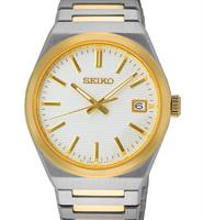 Seiko watch model SUR558. Quartz movement. Stainless steel 39mm round case with bracelet and gold tone accents. Silver color dial with date calendar. 100 meters water resistant